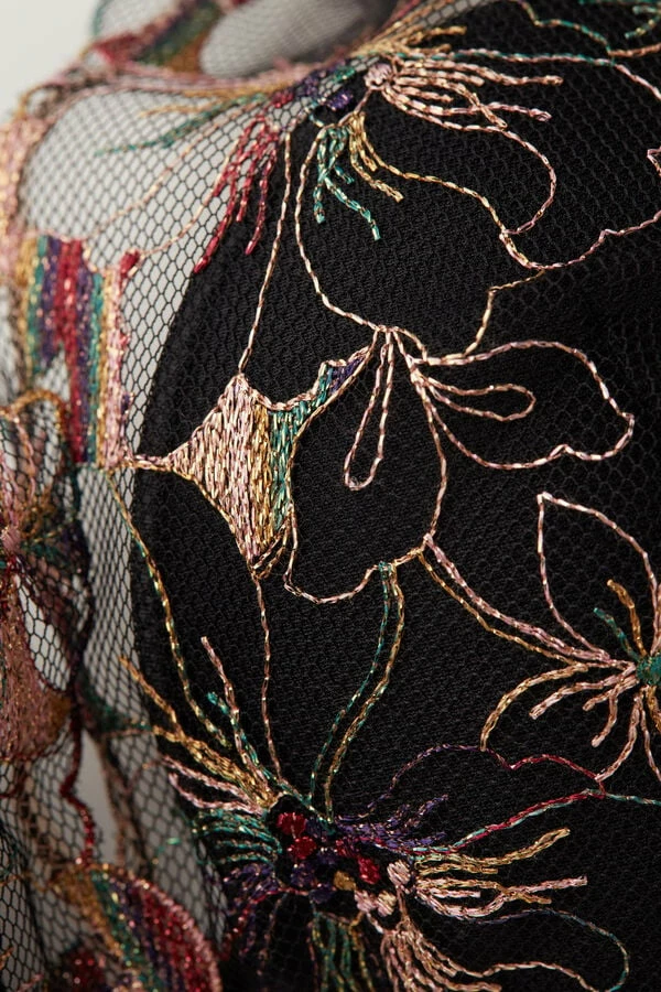 Giorgia balconette bra with underwire and cups with graduated padding that creates a one size larger volume effect. Made of embroidered tulle with multi-colored iridescent-like lamΓ© thread and trimmed with elegant satin details. Double braided straps with gold lamΓ© thread are adjustable in back. The scalloped deep V-neckline emphasizes the dΓ©colletΓ© and makes it the ideal bra for those looking for a romantic yet sensual style.