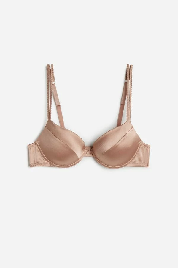 Bellissima slightly padded underwired push-up bra, styled in silk. Featuring elegant braided double shoulder straps and imperceptible stitching. Ideal for those who want a natural shape and light support in a simple, yet luxurious and refined bra. Adjustable back and straps.
