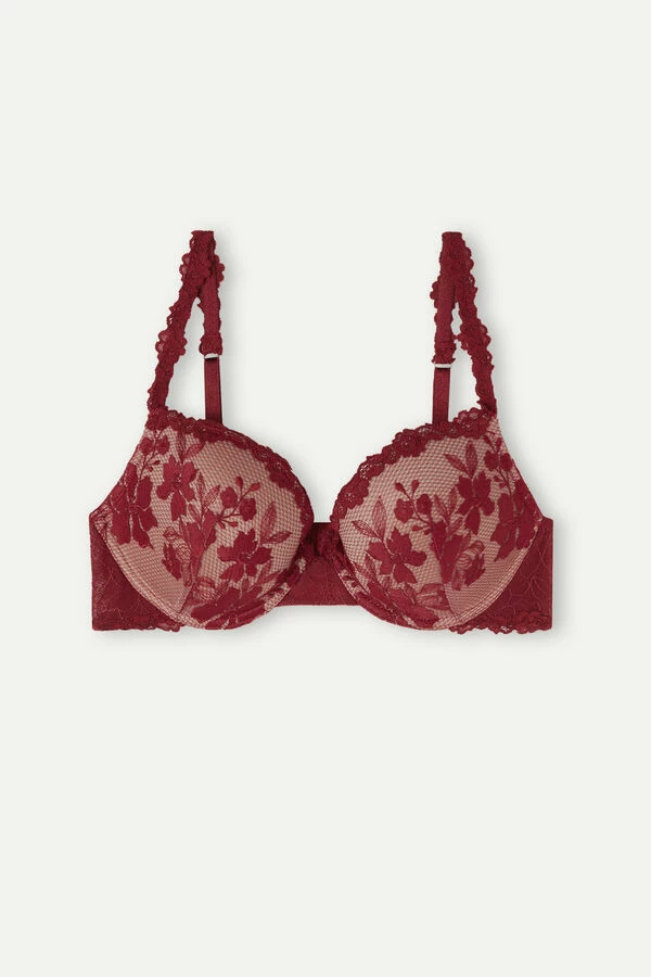 Elettra super push-up bra with underwire, made with a sensual tulle with floral embroidery and is embellished with elegant trim with floral lace ruffle. Underband in stretch tulle. The straps are adjustable in back. Ideal for emphasizing the dΓ©colletΓ© and to create the effect of being one size larger.