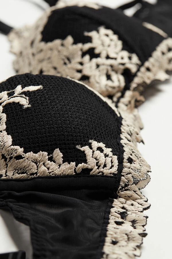 Tiziana lightly padded wireless triangle bra with side boning made in two-tone lace. Adjustable straps.