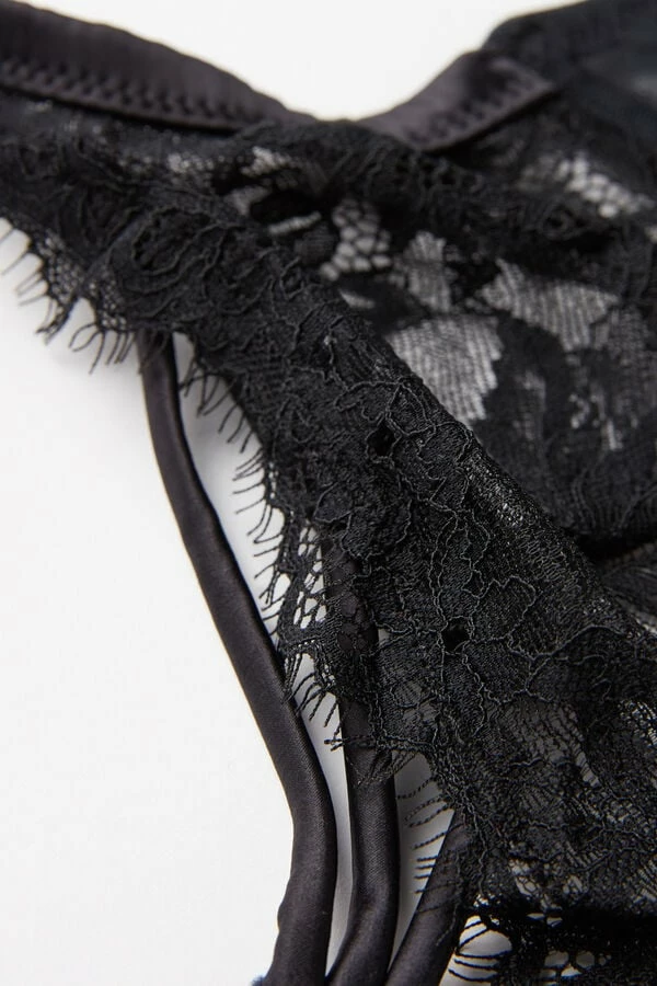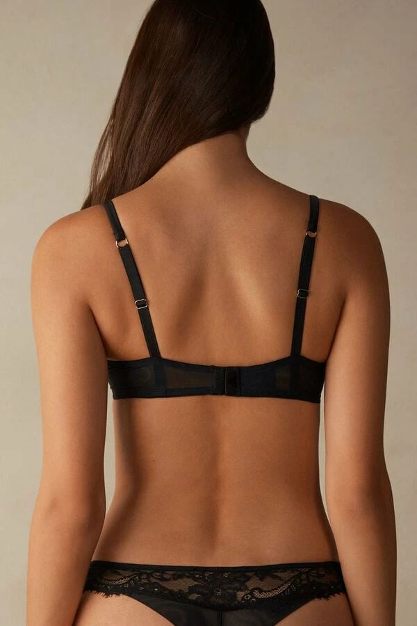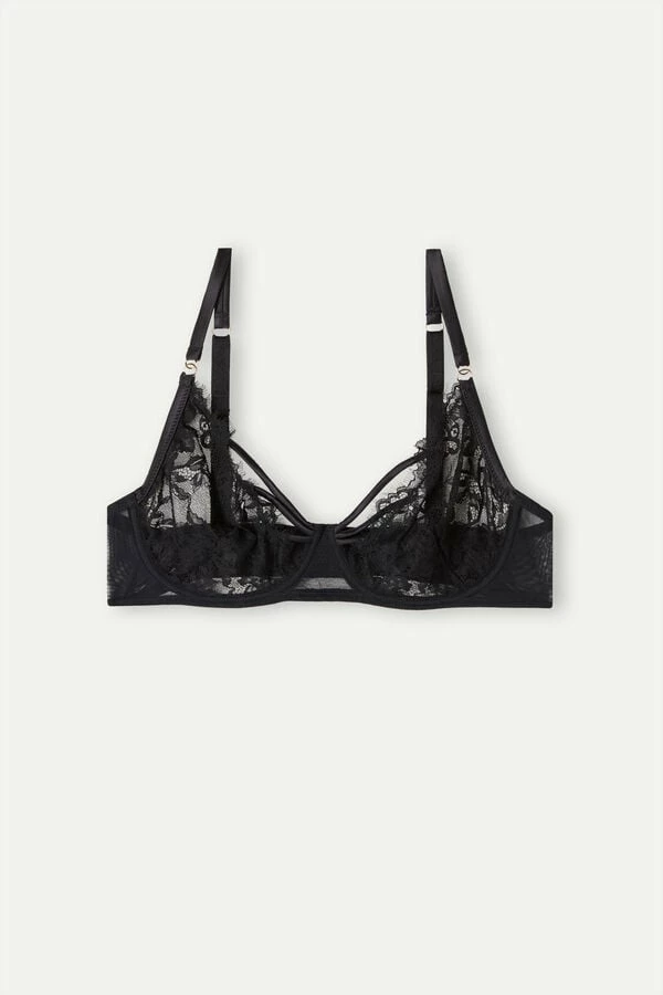 Underwire balconette bra made with a sensual stretch lace with a floral design. Intriguing satin trim on the cups and small gold jewel effect rings embellish this bra. Underband in tulle. The straps are lined in satin and adjustable in back. A design that highlights the dΓ©colletΓ© for a feminine and sensual style.